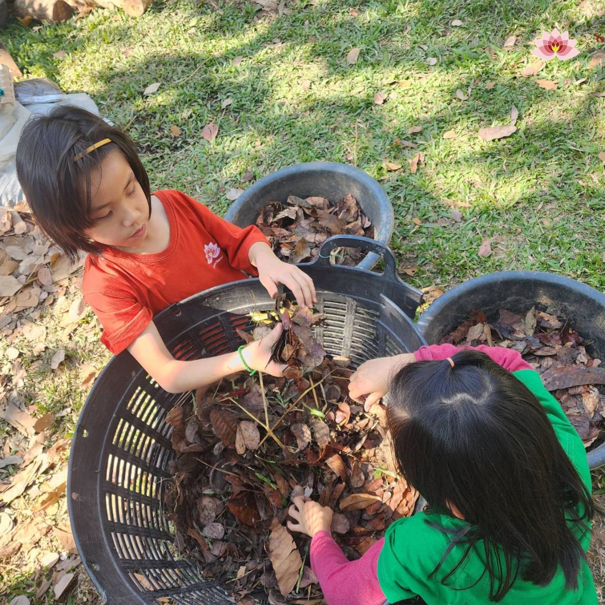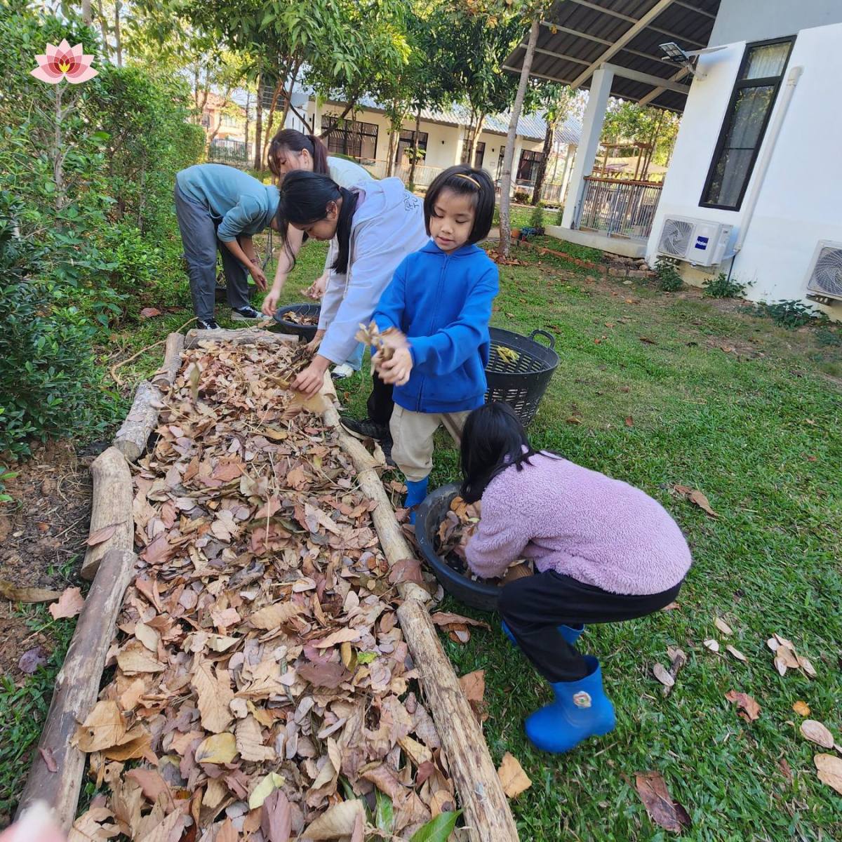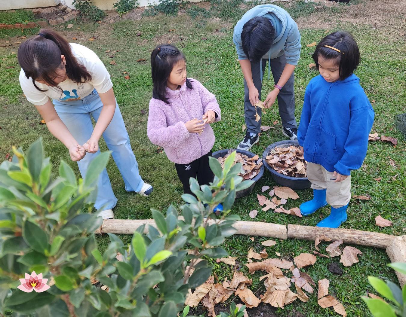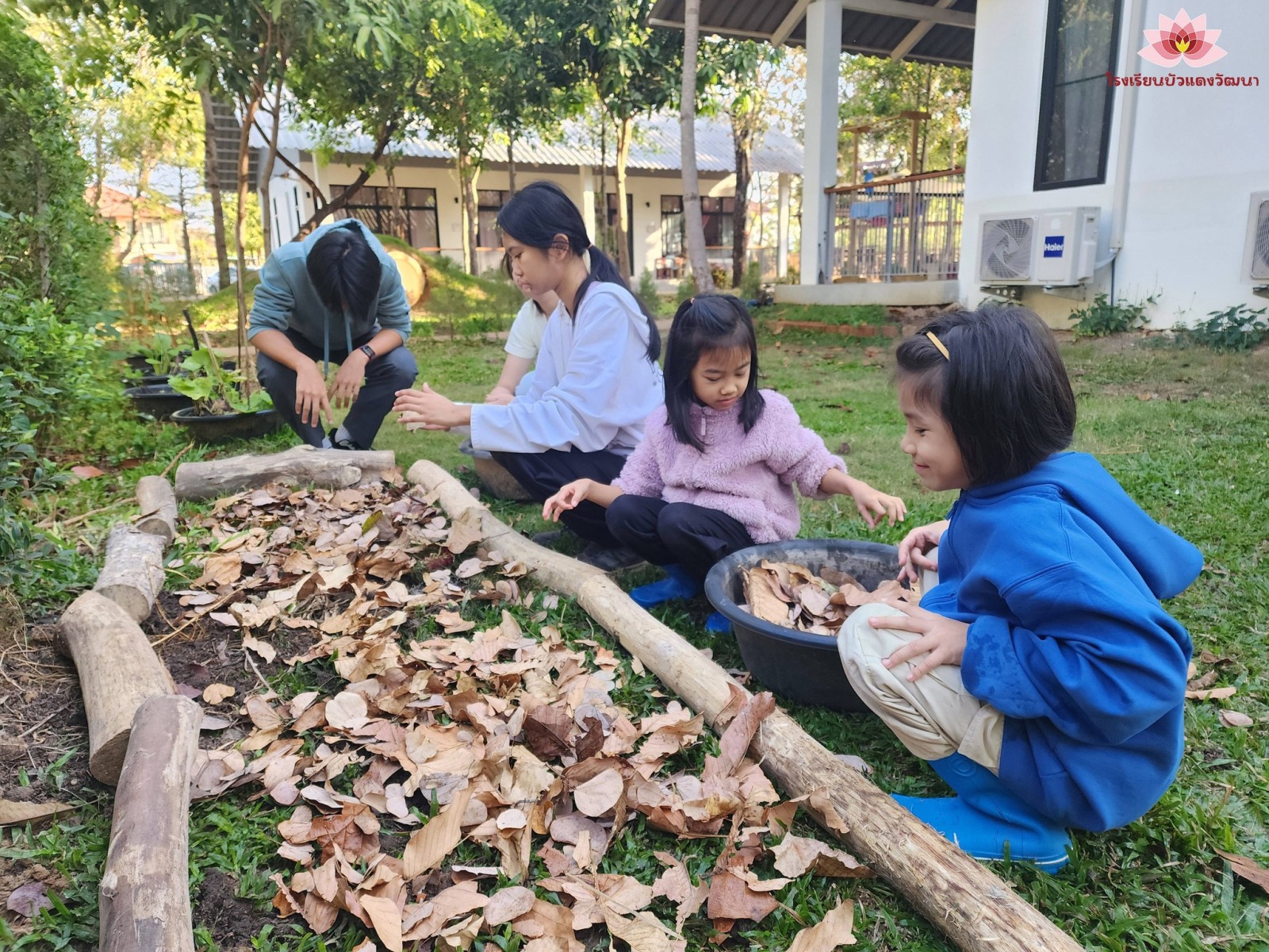เริ่มจากการเตรียมพื้นที่ให้พร้อม เด็ก ๆ ได้ฝึกการทำงานประสานกันระหว่างสายตากับมือ (Hand-eye Coordination) พี่และน้องช่วยกันคัดแยกเศษใบไม้แห้งและเตรียมดินลงในแปลงไม้ที่กั้นไว้โดยใช้มือกำใบไม้แห้งโรยลงไปบนหน้าดินทีละกำ คือการฝึกสมาธิ และสายตาที่จดจ่ออยู่กับน้ำหนักมือ เพื่อให้ใบไม้กระจายตัวสม่ำเสมอ