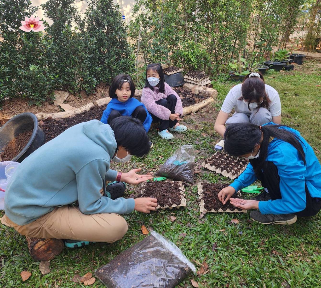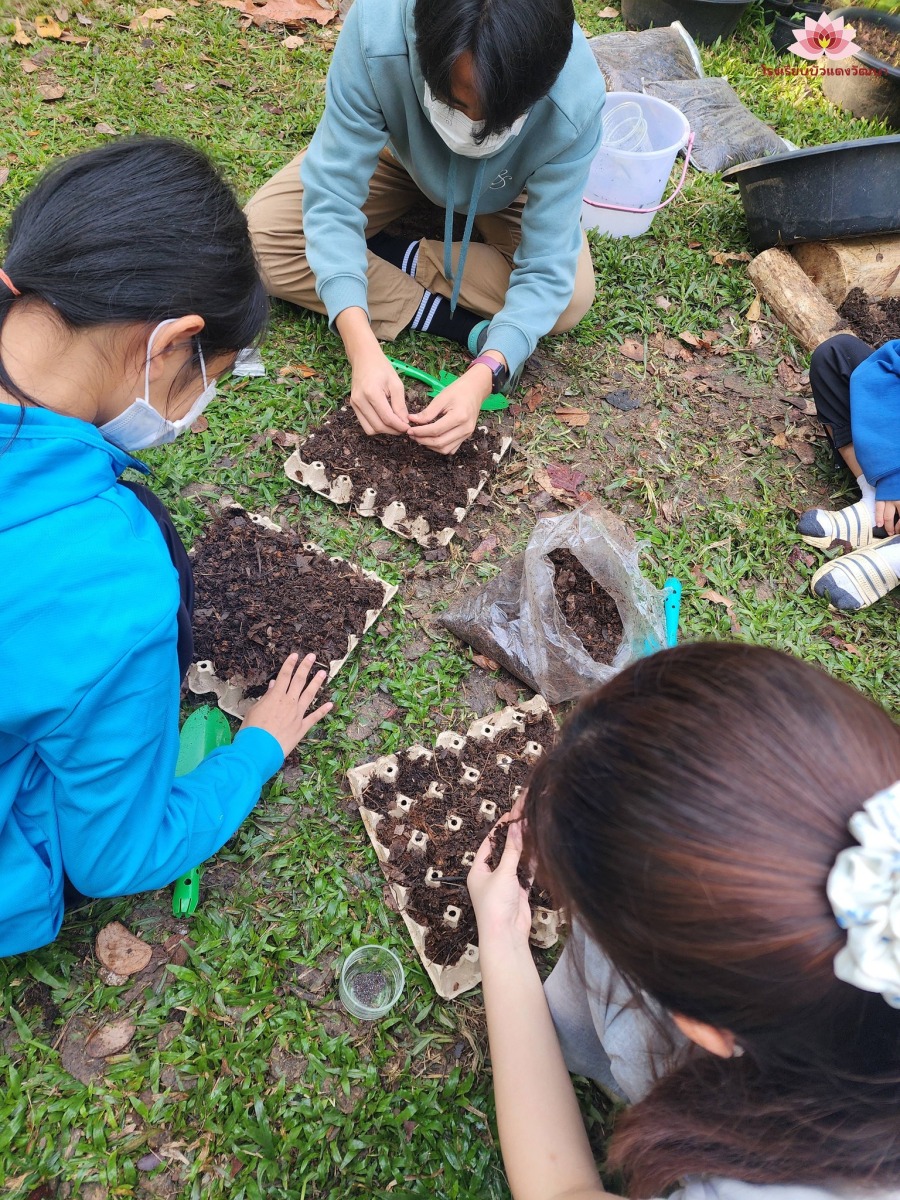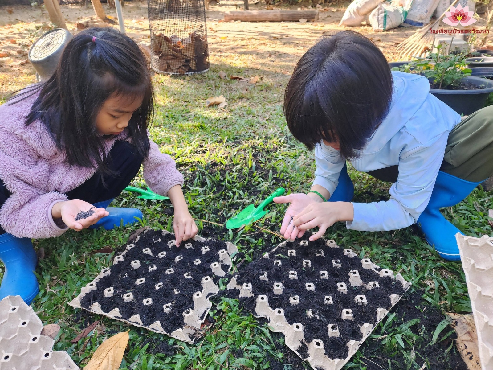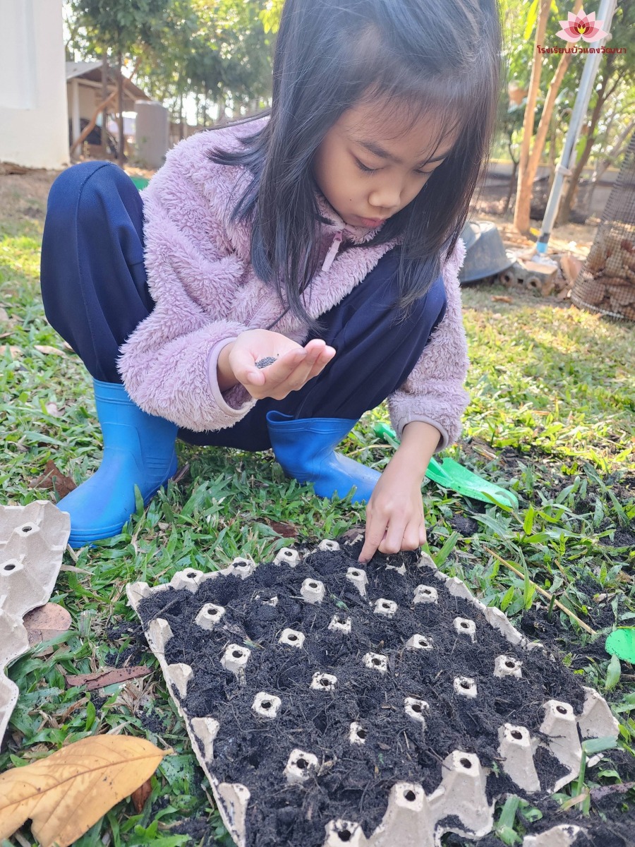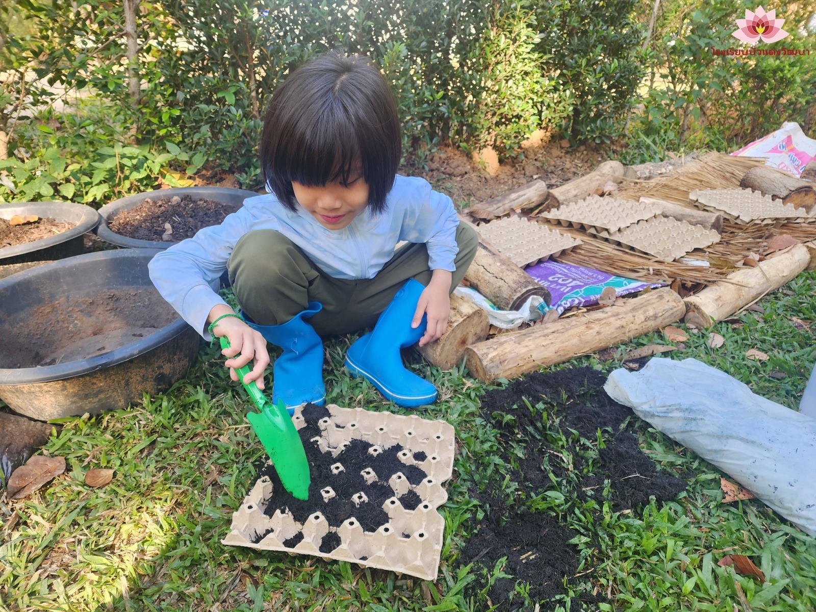 เด็ก ๆ เพาะกล้าในถาดไข่กระดาษ เมล็ดพันธุ์เล็กจิ๋วถูกวางลงบนฝ่ามือน้อย ๆ น้องต้องใช้ปลายนิ้วหยิบเมล็ดวางลงในหลุมอย่างเบามือ น้องเฝ้ามองว่าพี่ก็ตั้งใจทำขั้นตอนนี้เหมือนกัน จากนั้นพวกเขาต้องคอยรดน้ำ แล้วเฝ้ารอให้ต้นกล้าค่อย ๆ เติบโต ทำให้เด็ก ๆ ได้รู้ว่าธรรมชาติมีจังหวะของมัน และการรอคอยคือส่วนหนึ่งของความสำเร็จ
