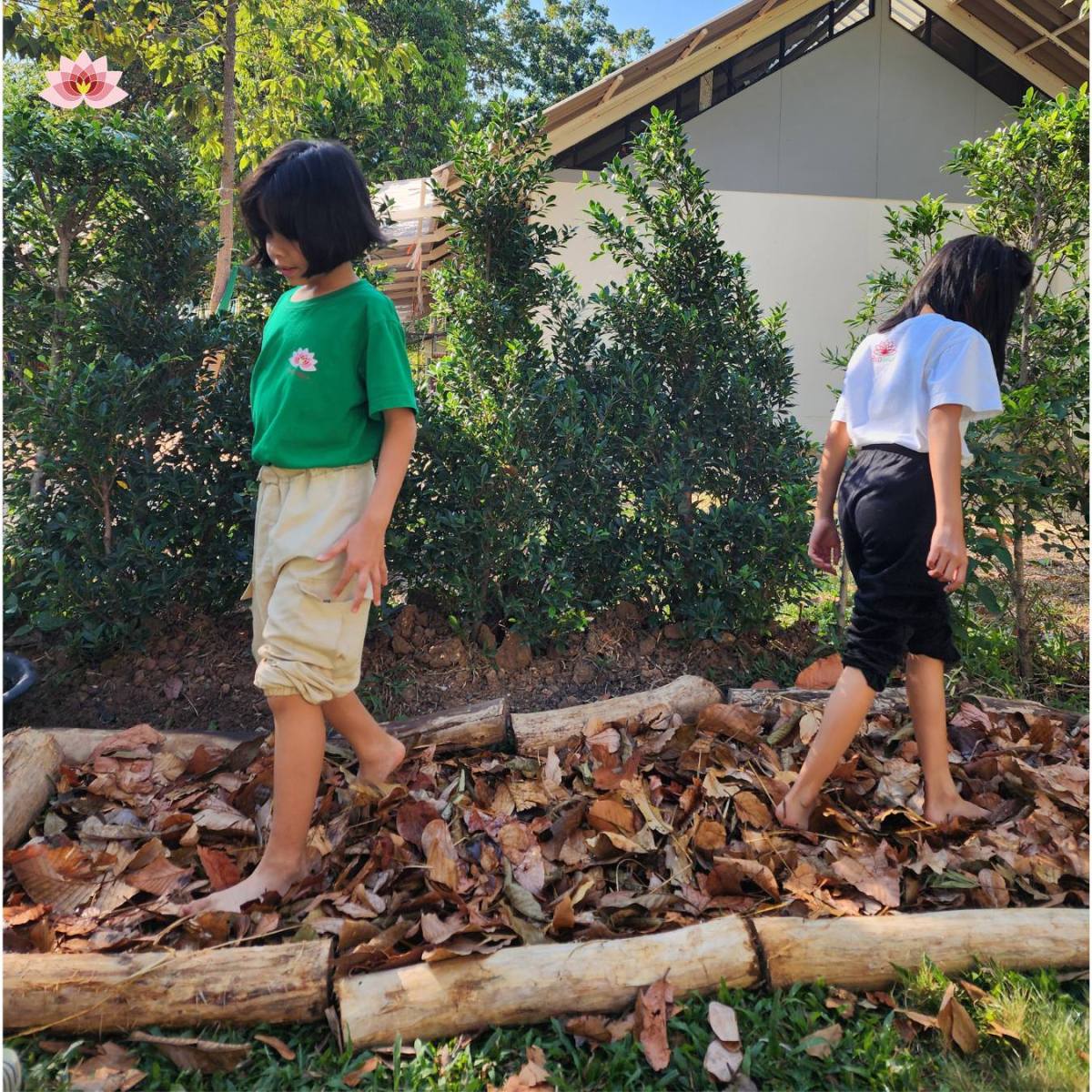 น้อง ๆ สนุกกับการถอดรองเท้า แล้วก้าวลงไปย่ำกองใบไม้แห้งในแปลงปลูก การให้เท้าสัมผัสพื้นดินและใบไม้ (Earthing) ช่วยเรื่องพัฒนาการทางระบบประสาทของน้อง