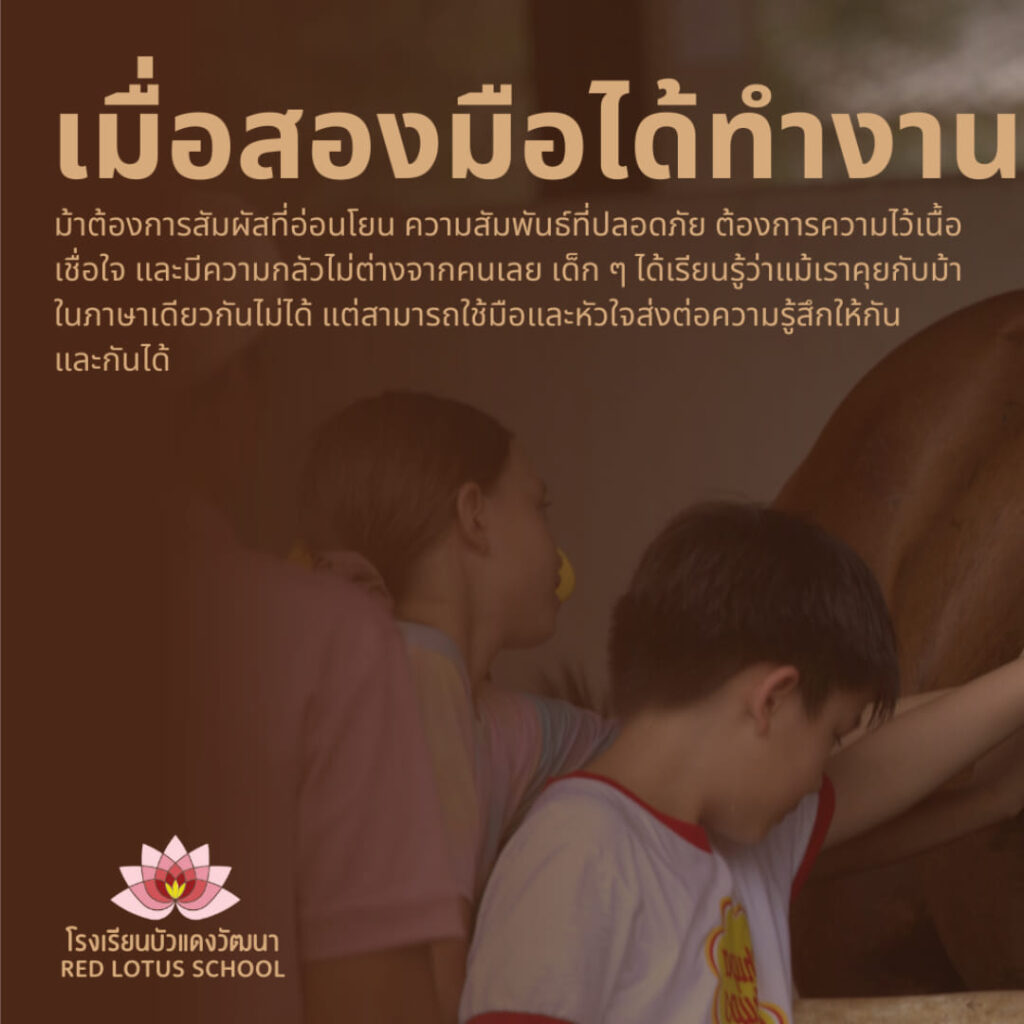 ม้าต้องการสัมผัสที่อ่อนโยน ความสัมพันธ์ที่ปลอดภัย ต้องการความไว้เนื้อเชื่อใจ และมีความกลัวไม่ต่างจากคนเลย เด็ก ๆ ได้เรียนรู้ว่าแม้เราคุยกับม้าในภาษาเดียวกันไม่ได้ แต่สามารถใช้มือและหัวใจส่งต่อความรู้สึกให้กันและกันได้